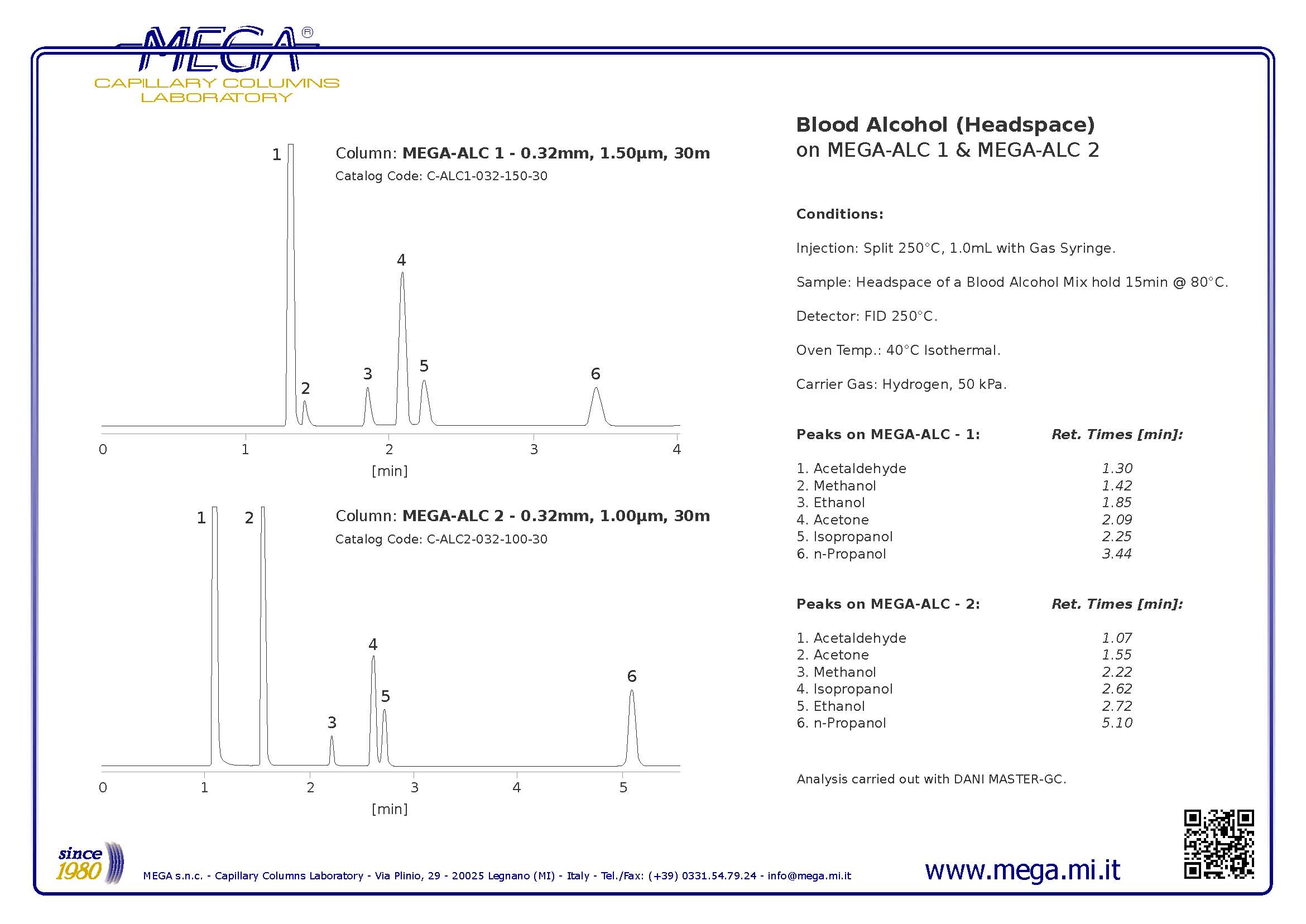 依據(jù)相關國家標準《中華人民共和國公共安全行業(yè)標準:血液酒精含量的檢驗方法》(GA/T 842-2009)和《司法鑒定技術規(guī)范:血液中乙醇的測定 頂空氣相色譜法》(SF/Z JD0107001-2010)的規(guī)定,我們向您推薦使用具有30多年專業(yè)生產(chǎn)和研發(fā)石英毛細管柱的企業(yè)-意大利MEGA公司產(chǎn)品:MEGA-ALC2,其具有的特點: