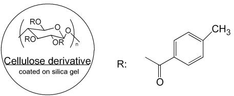 纖維素型是使用最廣泛的手性柱之一,纖維素型手性色譜柱的分離作用包括相互吸引的作用及形成包埋復(fù)合物。它們屬于Wainer分類中的第2種類型。市售的手性色譜柱為微晶三醋酸基、三安息香酸基、三苯基氨基酸鹽纖維素固定相。很多化合物可通過此類型的色譜柱得到分離。這種類型的手性色譜柱種類也很齊全。流動相使用低極性溶劑,典型的流動相為異丙醇-正己烷混合物。這類柱子根據(jù)制作工藝,分為涂敷與鍵合兩大類。但特別要注意由于氯可以使涂敷纖維素從硅膠上脫落,因此要確保涂敷類柱子流動相中無含氯溶劑。