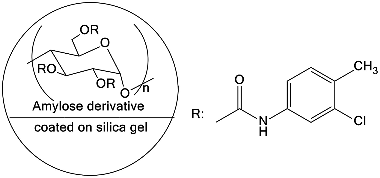 纖維素型是使用最廣泛的手性柱之一,纖維素型手性色譜柱的分離作用包括相互吸引的作用及形成包埋復(fù)合物。它們屬于Wainer分類中的第2種類型。市售的手性色譜柱為微晶三醋酸基、三安息香酸基、三苯基氨基酸鹽纖維素固定相。很多化合物可通過(guò)此類型的色譜柱得到分離。這種類型的手性色譜柱種類也很齊全。流動(dòng)相使用低極性溶劑,典型的流動(dòng)相為異丙醇-正己烷混合物。這類柱子根據(jù)制作工藝,分為涂敷與鍵合兩大類。但特別要注意由于氯可以使涂敷纖維素從硅膠上脫落,因此要確保涂敷類柱子流動(dòng)相中無(wú)含氯溶劑。