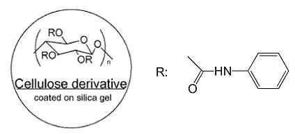 纖維素型是使用最廣泛的手性柱之一,纖維素型手性色譜柱的分離作用包括相互吸引的作用及形成包埋復(fù)合物。它們屬于Wainer分類中的第2種類型。市售的手性色譜柱為微晶三醋酸基、三安息香酸基、三苯基氨基酸鹽纖維素固定相。很多化合物可通過(guò)此類型的色譜柱得到分離。這種類型的手性色譜柱種類也很齊全。流動(dòng)相使用低極性溶劑,典型的流動(dòng)相為異丙醇-正己烷混合物。這類柱子根據(jù)制作工藝,分為涂敷與鍵合兩大類。但特別要注意由于氯可以使涂敷纖維素從硅膠上脫落,因此要確保涂敷類柱子流動(dòng)相中無(wú)含氯溶劑。